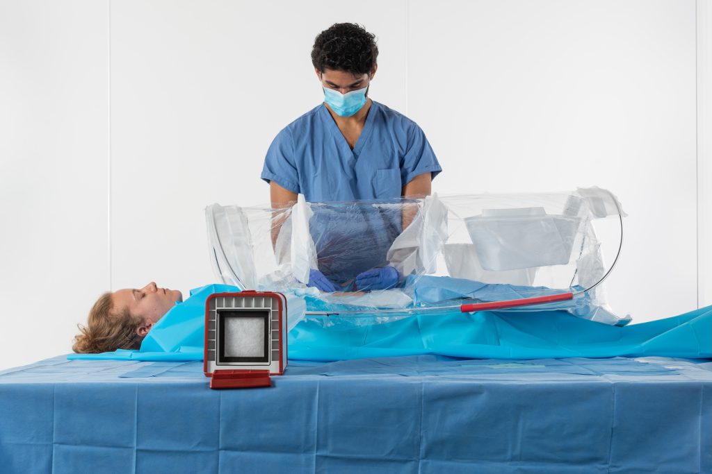 As artillery sounds continued all around them, the surgeon and the team worked with their hands inside the SurgiFieldโs protected environment. The transparent enclosure, the SurgiBubble, allowed visibility while creating a barrier against the debris and contaminants that filled the building.